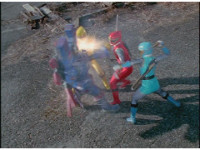 The Rangers whip out their swords and sparkily strike Mad Magnet, but it has no effect, he shrugs them off and sparkily strikes the trio until they fall down, Red sits up and talks, Mad Magnet fires his spear at the Rangers, bursting them. |