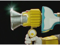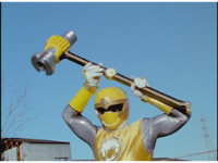 In a yellow energy tunnel, Yellow raises the Storm Striker and fires a yellow beam high, the end of which turns into a huge 100 ton weight. Mad Magnet reacts, as Yellow lowers the weapon, causing the weight to slam down atop the monster, crushing him explosively. |