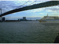 A luxury cruise ship transforms into the Dolphinzord while passing under a bridge. |