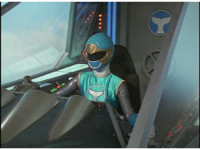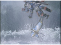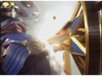Continued, Hawkzord flies to our left, while Dolphinzord swims submerged, popping out of the water to jump up in front of a SeaWorld-like stadium. |