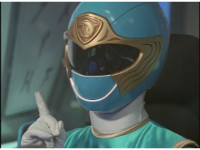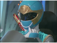 Dolphinzord jabs into Mad Magnet, then bounces him like a ball on her nose, zoom in on Blue talking, before Dolphinzord tail slaps him to shore, where he falls down. Blue clasps her hands happily. |