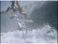 The flaming Hawkzord flies out of a flaming wall, and curls around Mad Magnet, wrapping him in flames, while Red talking while doing so. Zoom in on Blue in her cockpit, speaking and gesturing, before Dolphinzord floats forth in front of a huge tidal wave. |