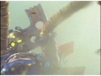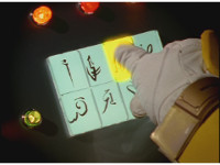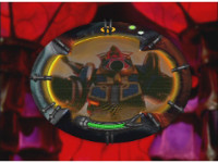 Cuts follow-ups of Storm Megazord on monitor; then shot of Red watching schematics onscreen. |