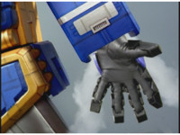 Red nod-talks as his two teammates' cockpits slide into the same screen, they respond then all make hand gestures, as the screen transitions out into Lion's paw rising off the ground, as Lionzord transforms into most of a body, Dolphinzord becomes the right arm, and Hawkzord transforms into the head, connecting atop, forming the steam-releasing Storm Megazord. |