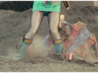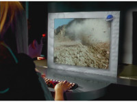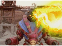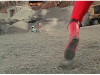 The camera races to the edge of a quarry cliff, and stops in view of Terramole sparkily striking Red & Blue. |