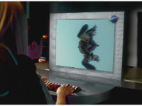 Red slaps his hands and victory-signs to his console, Blue cheers and clasps hands, and Yellow merely sits back, and relaxes. |