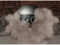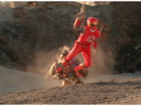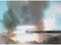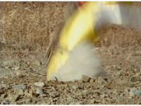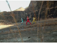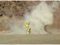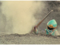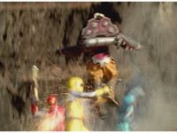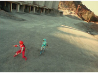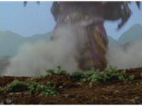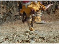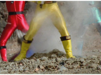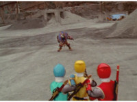 Terramole remains subterranean, so Yellow nod-talks, then gestures, and spins into the ground, the two dust-ups from his underground burrowing and Terramole's heads toward one another, the other two Rangers watching, as they collide underground, Yellow ending up flipping out of the ground, landing harshly as his teammates regroup around him, before Terramole surfaces, and talks while gesturing a lot. |
