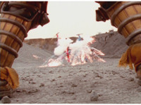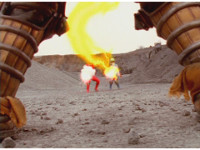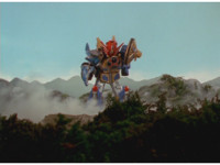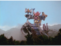 Cuts follow-up of Megazord posed in front of flames. |