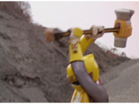 Terramole talks, gestures, then dives into the ground, Yellow nod-talks and grips his controls, as Storm Megazord raises the Ram Hammer, and slams it down sparkily, quaking the area. |