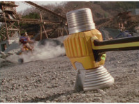 In a yellow energy tunnel, the trigger is pulled, and Yellow raises the Storm Striker, firing a yellow beam high, the end of which turns into a huge 100 ton weight. |