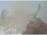 Terramole strolls, talks, and gestures, when he spark bursts, he turns, looks and sees the Wind Rangers lowering their blasters, Red talking and pointing, then Yellow talking and raising a fist, before the monster replies to the trio. |