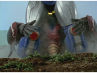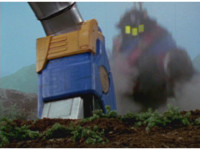 Lightning Mode leaps up and strikes at Terramole, who ducks underground, leaving the Megazord glancing about, before he pops back up behind it and grabs its legs, dragging it down into the ground. |