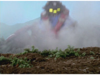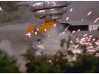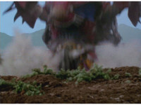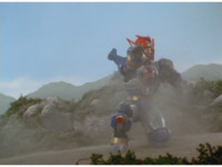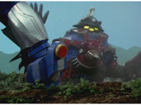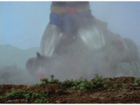 Terramole is ejected from his subterranean hiding place, flipping over in front of the Megazord. |