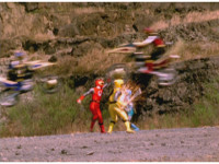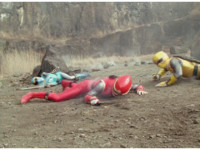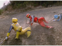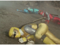 The Thunders come to a park, and barely glance back at the Rangers in their dust, each one trying to recover and failing, Yellow then talking as he slightly sits up. |