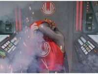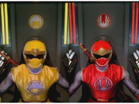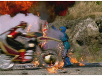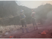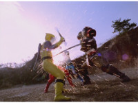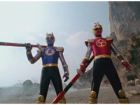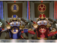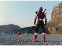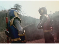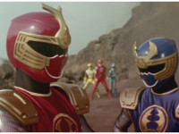 The Wind Rangers fall down, Red then getting up and looking forth, spotting the Thunder Rangers rising up from a crouch amid smoke and flames, standing still and silent, the Wind Rangers reacting, before Crimson speaks, turns to them, Navy doing the same, the Rangers reacting some more. |