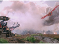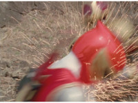 Explosions erupt around Insectizord, before the flaming Hawkzord curls around it, repeatedly circling it, Red gesturing briefly, before a flaming boulder rolls away, Crimson talking inside the flaming cockpit, as the boulder erupts to reveal Insectizord safely within, Crimson reaches down and presses a button, firing Insectizord's cannon and guns forth, blasting all around Hawkzord, shaking up the cockpit as it swoops down from on high. |