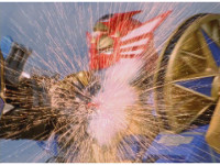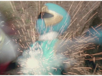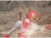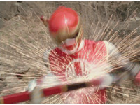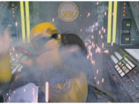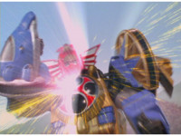 Thunder Megazord charges up Spin Blade and tosses energy sparkily at Storm Megazord, shaking up its cockpits. |