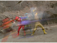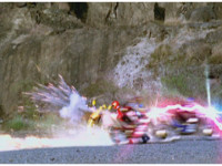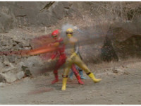 The Thunder Rangers suddenly dash forth and turn into streaks, and streak back and forth, sparkily slashing the three Wind Rangers repeatedly, until the trio falls down, where they each talk forth while slowly recovering. |