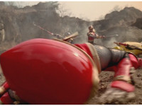 Storm Megazord lies on the flaming ground, spark bursting. |