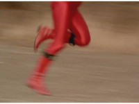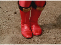 Red runs in place, then leaps up and glides toward the Thunders whipping his sword about, Navy speaks, then charges in, leaps up, and jump kicks into Red, pushing him back as he continues to fly through the air. |