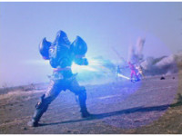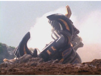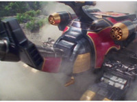 Downward angle on Storm Megazord sparking on the ground on its back. |