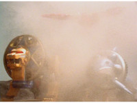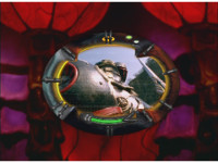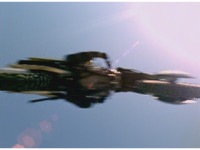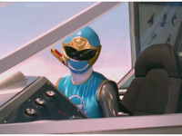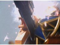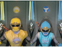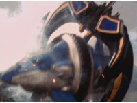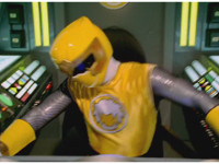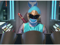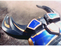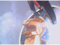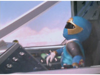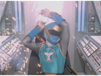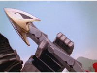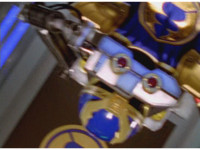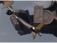 Navy nod-talks upside down, as the Beetlezord holographically vanishes, just as Lionzord steps down on it, Yellow nod-talks and glances about, as does Blue, when Beetlezord decloaks behind her, comes to a stop, and fires its pinchers at the Dolphinzord, sparkily grasping Blue's Zord, jolts her about, and she tries to fly to get away, Yellow & Red react, as Dolphinzord in unable to escape as Beetlezord spins it around in a circle repeatedly, while Blue talks and struggles in her cockpit. |