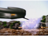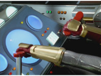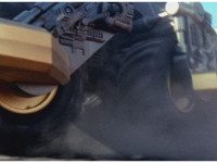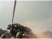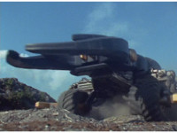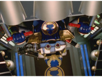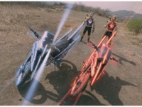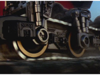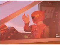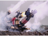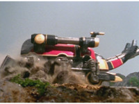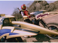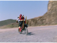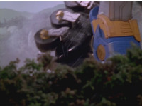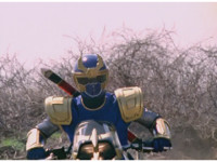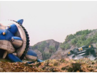 Side angle of Crimson talking in his cockpit, when he pulls over the heads-up display visor thingy, pulls a lever, the treads of his Zord roll onward, as the Insectizord rides over rough terrain. Navy pulls his visor thingy over, grips the controls, and the Beetlezord rides over quite a few bumps. The Winds stagger back as the two Zords approach. |