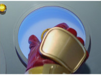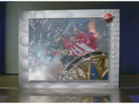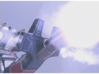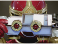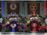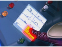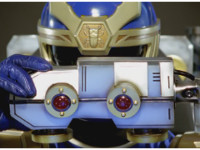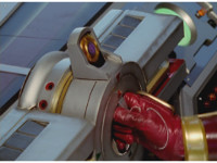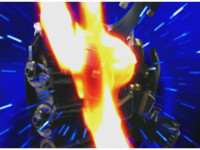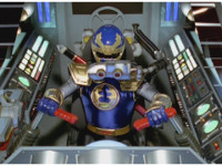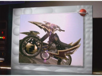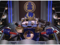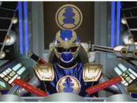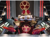 Computer monitor shows a design of the new Power Disc, which then is teleported into the console port, Red goes to reach for it and it's sucked back into the portal, causing him to talk, Yellow & Blue react, zoom out from Storm and into Thunder, as the disc ends up in Crimson's console port. He takes it, talks, then inserts it into the slot and turns the lever. Power Sphere 04 pops out of Thunder Megazord's chest and hatches into the Spin Blade. |