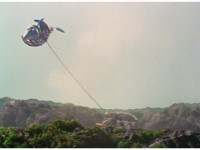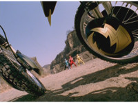 The Wind Rangers flip over the edge of a cliff, then roll back up into defensive positions, as Crimson leaps over the screen on his Cycle. |