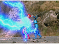 Crimson & Navy pull out their Thunder Morphers, talk, then raise them to the sky, they crackle, causing lightning to crash down and burst the ground around the pair. |