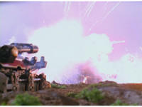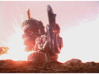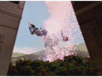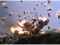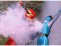Cuts prior shot of Zurgane knocking Red down; Cuts follow-up close-up of Rangers exploding. |