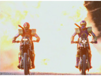 Continued from two shots ago, the Thunders mount their Cycles, then rev up and drive them forth, the Winds reacting. |