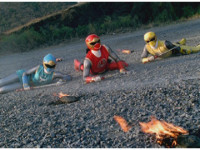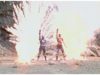 Explosion erupts behind the Rangers, sending the trio flying. |