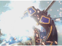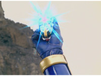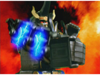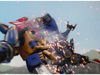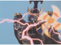 Storm Megazord finishes sparking, when Thunder Megazord slides by and sparkily slashes it, three hits total, until Storm is doubled over while Thunder turns and faces it triumphantly. |