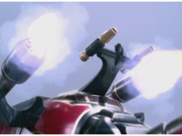 Continued from two shots ago, Blue & Red fire their blasters at Crimson sparkily, but it fails to stop him as he fires electricity back at them explosively, and drives by them. |