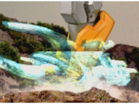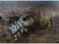 Blue looks left and talks, as Beetlezord jumps out from hiding, and sparkily grips its pinchers upon Lionzord's head, jolting Yellow about, as it continues to clench upon his Zord, Yellow talking as he gestures his hand and does a neckroll, Lionzord then firing a wind & dirt tunnel at Beetlezord, sending it tumbling and rolling away, before Yellow grips his controls. |