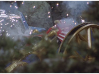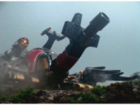 Zoom out on a downward angle on Storm Megazord sparking on the ground on its back. |
