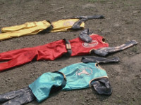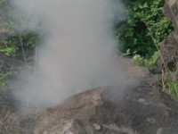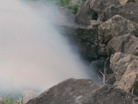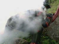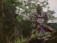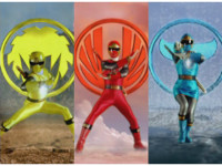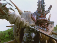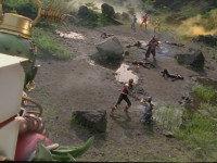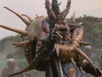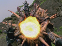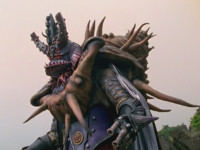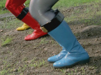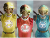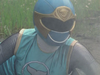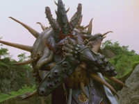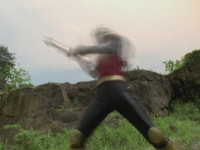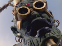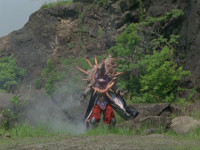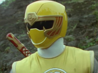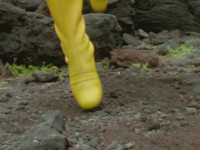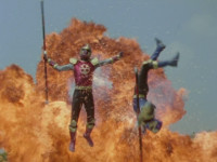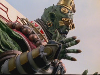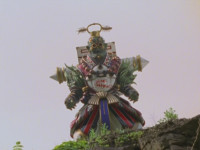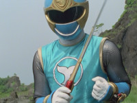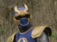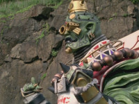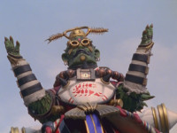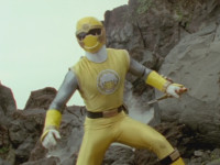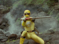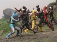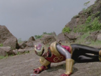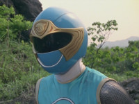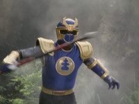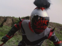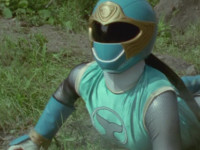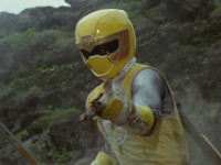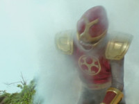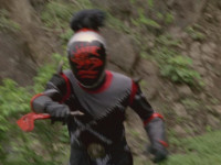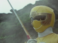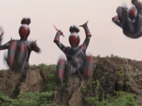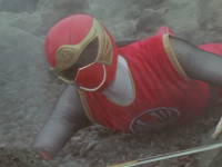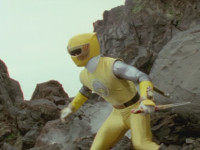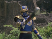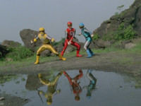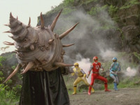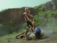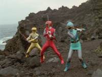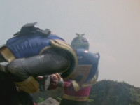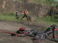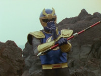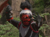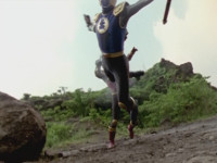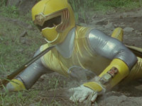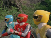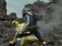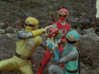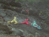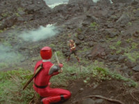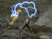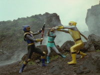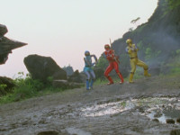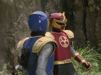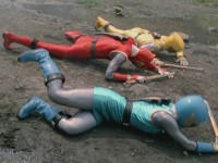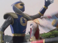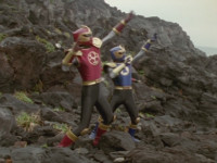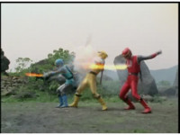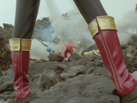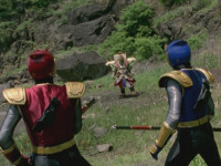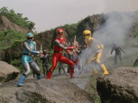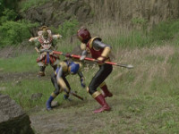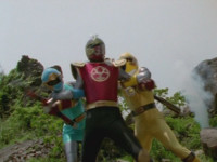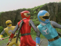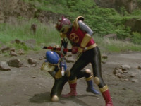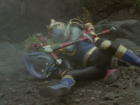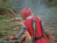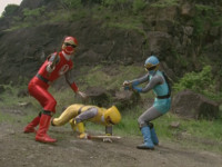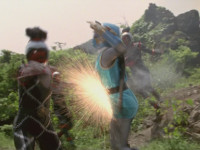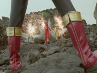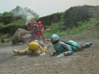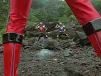 Yellow falls and rolls to the ground, as Red & Blue regroup defensively around him. Steam begins to rise from nearby rocks, which the Winds take notice of. Supertoxipod talks a lot while gesturing arms. The Rangers react to him, when three Kelzaks leap up and flip over at the Winds, sparkily striking them, causing them to turn into empty costumes! This leaves a Kelzak puzzled, until Red kickjumps in from the side. |