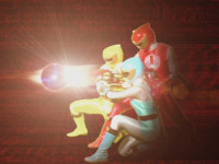 Navy stands and reaches out, before rushing forth, Crimson sparkily slashes Blue & Yellow down, when Navy comes in and grabs him from behind, he breaks free, sparkily slashes Navy repeatedly until he falls. Navy blocks Crimson's staff with his own, though he breaks free of the hold and sparkily strikes Navy some more, before finally flipping him over. |
