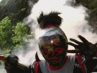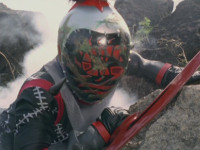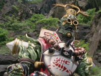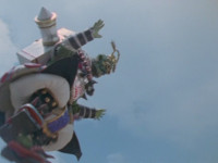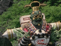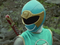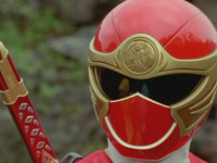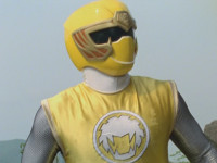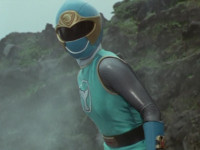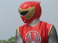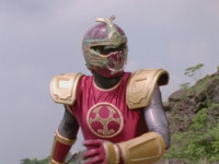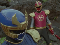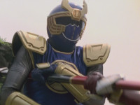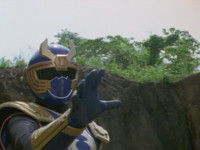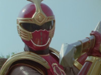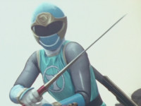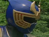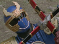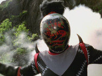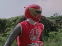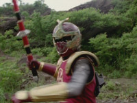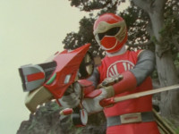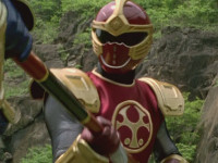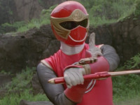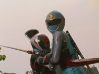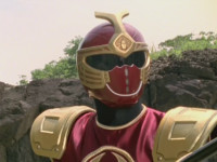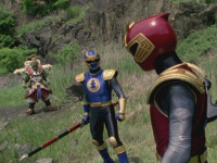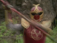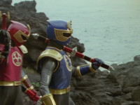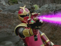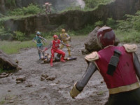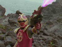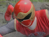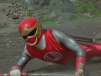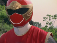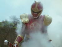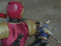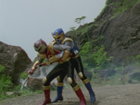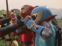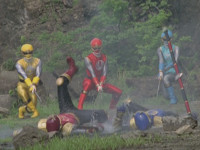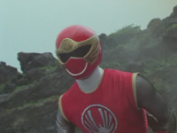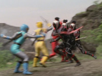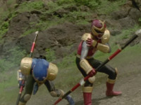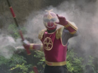 Red pushes Crimson down, he recovers, the Winds rally around Navy defensively, Red talking and gesturing, before motioning to ground, causing colored smoke to erupt, hiding the four Rangers' escape. Crimson reacts, whipping his staff in the air angrily, zoom out from Choobo as Supertoxipod steps in, talking, finally Choobo talks with arm motions. |