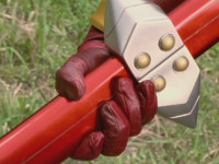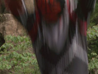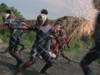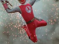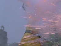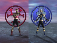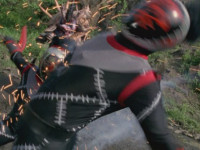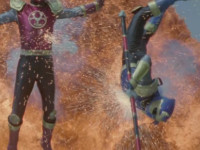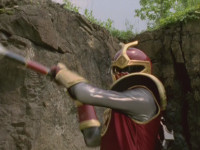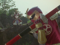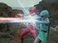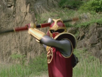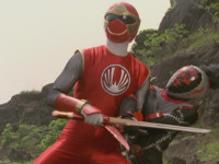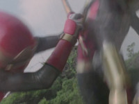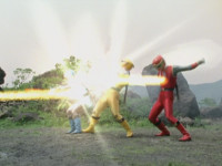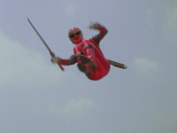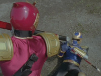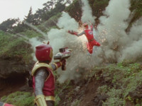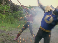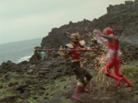 The Winds whip out their swords, then ninja-streak up, the Thunders also streaking into the air, the two sets of Rangers streak-fighting for a moment, before dropping back down to the ground and battling. Red gets sparkily struck by Crimson a few times, before he flips up onto a ledge, pulls out his Hawk Blaster, and fires it down on Crimson, bursting about, before he fires back with his Crimson Blaster, bursting him off his perch. |