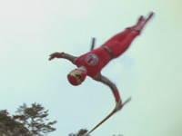 Cuts before he hits the ground; cuts a lot of usable surrounding footage of Crimson beating on Navy, and Winds getting beat down by monster. |