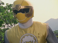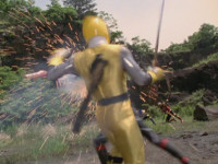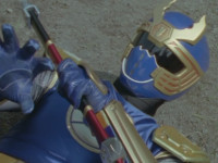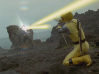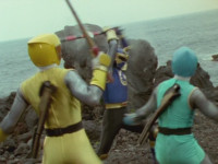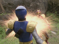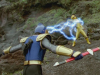 Blue & Yellow strike swords at Navy's staff, he blocks and sparkily slashes them away. Yellow rolls to a recovery and gestures while aiming his Morpher wrist forth. |