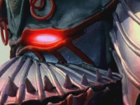 Navy turns to Crimson, talking to him, then back to Choobo, Crimson's faceplate shimmers some more, before he looks forth, clenches his fist, grips his staff, whips it around, Navy notices just before he sparkily slashes him in dramatic slow-motion. |