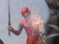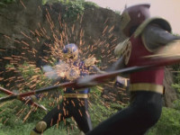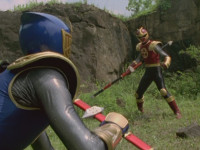 Navy lies prone and smoking, talking to Crimson, who responds and readies his staff, then charges at Navy, who gets back on his feet just to dodge the staff a few times, before finally gripping it under his armpit and talking, Crimson responds, then pulls it out of his hold and sparkily slashes Navy thrice. Pan over to the Rangers still fighting Kelzaks, Red pauses to talk, as does Blue. |