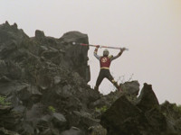 Crimson climbs up on some rocks, shouting and raising arms, before whipping staff about. |