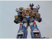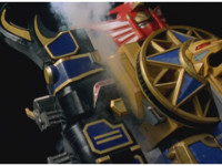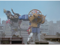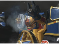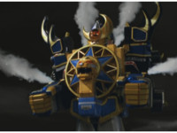 Thunderstorm Megazord pulls the cord through its Lion chest, firing energy from its chest, back-cannon, and shoulder gatling. |