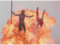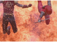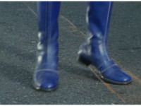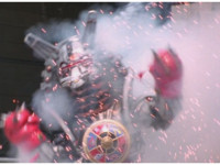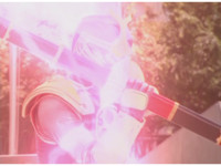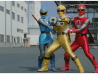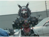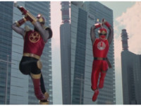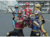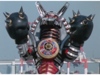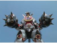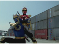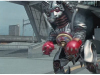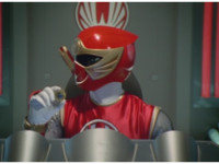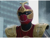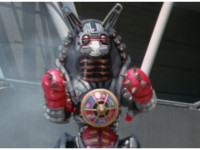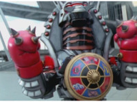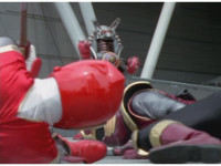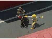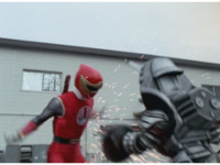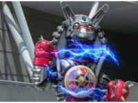 Red & Crimson leap at Bopp-a-roo with their blades and sparkily slash him, he rolls, recovers, his chest dial spins to house fire, and he then charges up with flames, firing fiery bursts from his boxing gloves at the pair burstingly. |