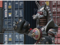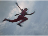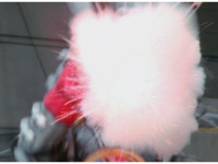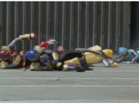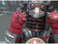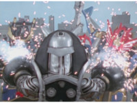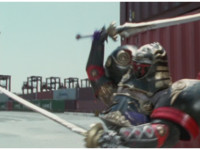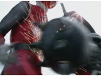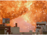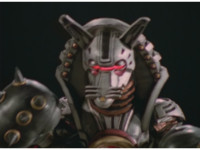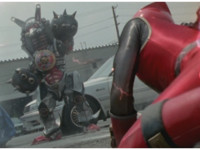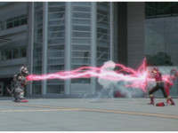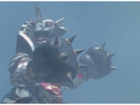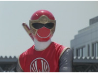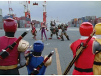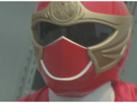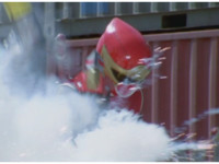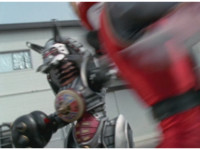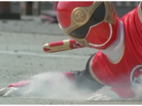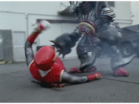 Cuts follow-ups of Red recovering, firing shurikens at monster, who then turns dial to bomb. |