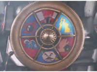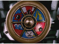 Bopp-a-roo slams fists together, facing the five Rangers as they all pace right. Bopp-a-roo's chest dial spins to house fire. |